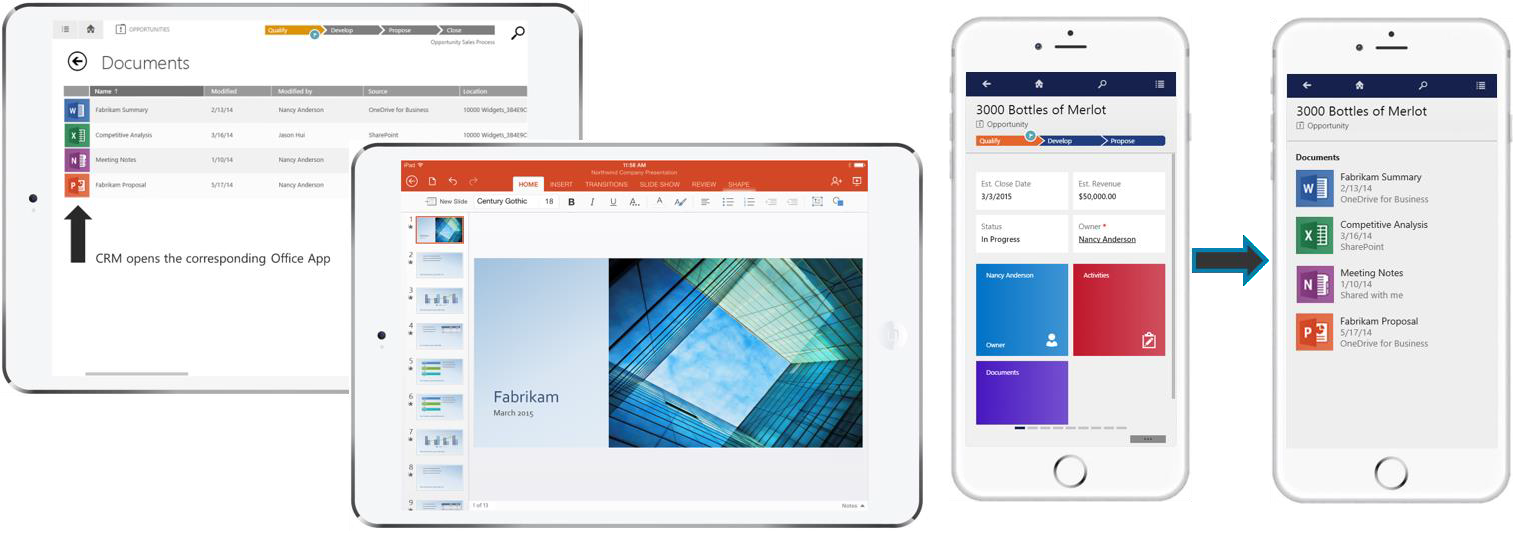 In der Mobile CRM 2016 App können Sie einfach auf Ihre PowerPoint-Präsentationen oder Word-Dateien zugreifen, ohne zwischen den Anwendungen wechseln zu müssen. Durch die Integration im Dynamics CRM können Sie ganz einfach alle Ihre Office-365-Anwendungen auf Tablets und Smartphones öffnen.
